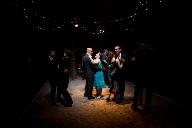 Hecha la conveniente precisión, el proyecto es absolutamente pertinente y ha conseguido que muchos vecinos participen en una actividad que suele estar alejada de aquellos territorios. De esta manera, podemos ver en escena a gentes de Usera aportando su espontaneidad y entrega con actores de máximo nivel en un teatro, el Matadero, que da cabida a propuestas modernas e, incluso, arriesgadas. Y, como frecuentemente ocurre con estas mezcolanzas, algunas historias funcionan mejor que otras, aunque todas se distinguen por el encanto y por resultar entrañables. Contamos con una estupenda colección de géneros que se entreveran con una fluidez inmejorable, en una ida y vuelta recursiva de algunos de los cuentos. Quizás la historia que puede servir de columna vertebral es la escrita por Denise Despeyroux, en la que conocemos cómo se fragua una pareja, precisamente en las butacas del teatro ─la Kubik, la sala que cerró hace unos meses y en la que durante varios años se le dio vidilla escénica a la zona. Pilar Gómez, con gracejo y soltura, lucha con afanosa positividad para contrarrestar la pesadumbre y el pesimismo de su pareja, un Juan Antonio Lumbreras, que vuelve a demostrar su habilidad para plasmar un sarcasmo sutil en su verborrea asfixiante. Ambos nos llevan a través de un diálogo que se descuelga en absurdos que nos sorprenden sobremanera. Se cuelan, entre medias, otras historias con menos desarrollo, como «El 37» de José Padilla, una extraña aventura de criados y sirvientes. Luego nos topamos con una de esas piezas que tanto caracterizan a Alfredo Sanzol, «Copacabana», en la que aquel famoso salón de baile se ha metamorfoseado en una oficina de la Agencia Tributaria, y, como es habitual en el dramaturgo, nos lanza de cabeza a lo sorpresivo y paradójico; por un momento parecía El amor en los tiempos del cólera versión castiza. Seguramente sea «El vampiro chino», el texto firmado por Alberto Olmos, el más irónico y el que aprovecha para dejar patente la amplia presencia de la comunidad oriental a lo largo y ancho de esas calles. Huichi Chiu, además, interpreta, con su habitual hieratismo mordaz, a ese muchacho sediento de sangre correteando por las azoteas. En el vaivén de los relatos y el baile que se montan con los más voluntariosos del público, aparece también el drama; tanto con «La Narcisa», esa mujer a la que le han quitado un hijo y que piensa que puede ser El Cordobés; como «El sereno», una crónica propia de El Caso. El final, con el escrito de Miguel del Arco sobre la famosa estampida de Lou Reed en el estadio del Moscardó, nos devuelve a los años donde la llegada de estrellas era todo un acontecimiento imperdible. El jolgorio que preparan es formidable. Debemos valorar muy positivamente la participación de los vecinos sobre todo la frescura de Juan Antonio Montes (Chucho) y la magnífica interpretación de Luis Ureña con ese borracho lleno de credibilidad. Concluye así un espectáculo que ha contado con la escenografía de Alessio Meloni, quien ha jugado con elementos alusivos a las propias calles de antaño como la arena y la gran farola que concentra nuestra atención. La función se ha tejido con la buenísima disposición de Alberto Sánchez-Cabezudo, que ha querido trascender el hecho teatral y creativo a una cuestión social, a un acercamiento a un barrio que también se merecía poseer una sala donde habitar. Estas Historias de Usera, con la salvedad comentada al principio, saben combinar la nostalgia y la memoria de épocas pretéritas con las transformaciones que han esculpido el distrito en lo que hoy es: una zona muy golpeada por la crisis, con nuevos inquilinos, pero también con ansias de modernización.