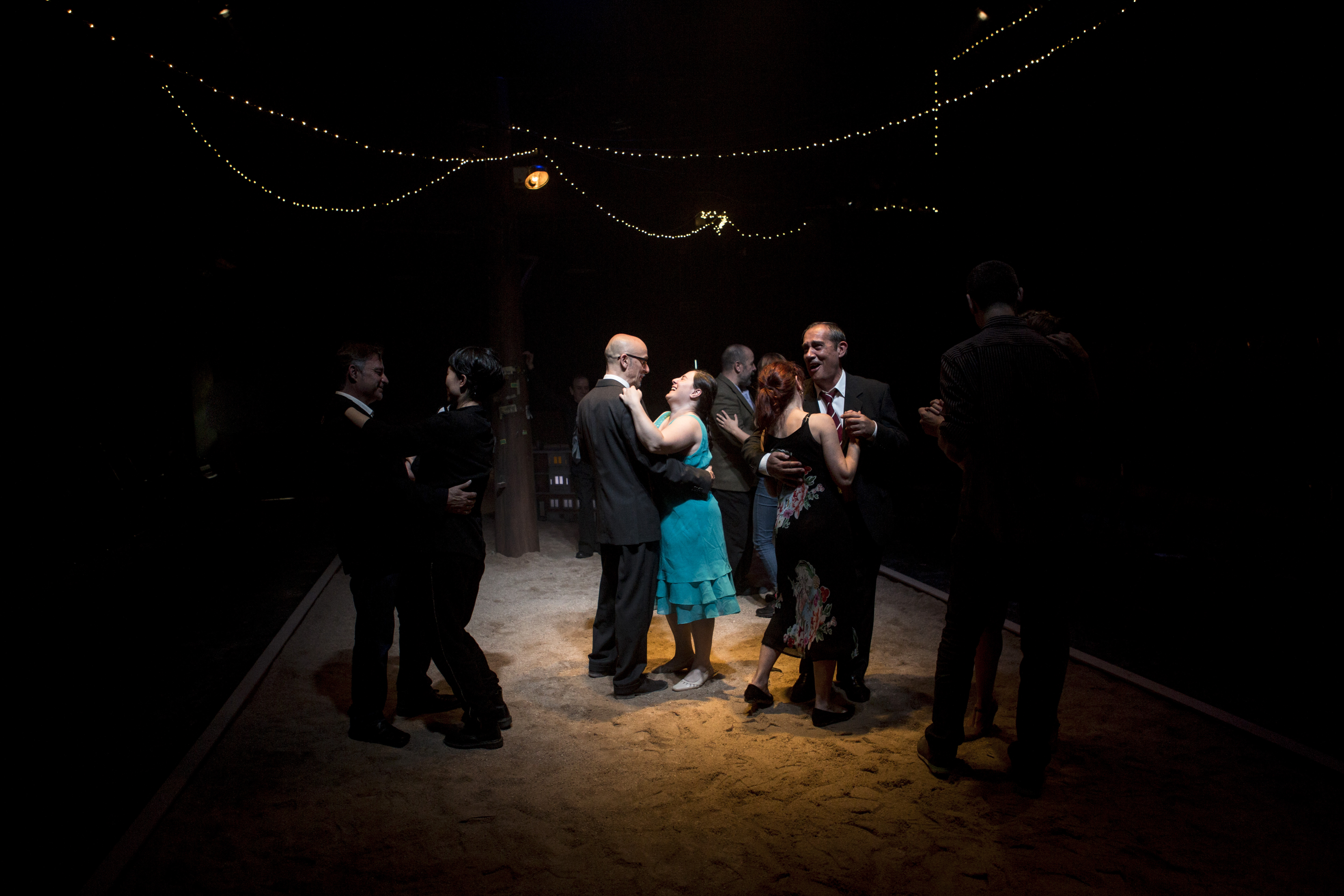 Hecha la conveniente precisión, el proyecto es absolutamente pertinente y ha conseguido que muchos vecinos participen en una actividad que suele estar alejada de aquellos territorios. De esta manera, podemos ver en escena a gentes de Usera aportando su espontaneidad y entrega con actores de máximo nivel en un teatro, el Matadero, que da cabida a propuestas modernas e, incluso, arriesgadas. Y, como frecuentemente ocurre con estas mezcolanzas, algunas historias funcionan mejor que otras, aunque todas se distinguen por el encanto y por resultar entrañables. Contamos con una estupenda colección de géneros que se entreveran con una fluidez inmejorable, en una ida y vuelta recursiva de algunos de los cuentos. Quizás la historia que puede servir de columna vertebral es la escrita por Denise Despeyroux, en la que conocemos cómo se fragua una pareja, precisamente en las butacas del teatro ─la Kubik, la sala que cerró hace unos meses y en la que durante varios años se le dio vidilla escénica a la zona. Pilar Gómez, con gracejo y soltura, lucha con afanosa positividad para contrarrestar la pesadumbre y el pesimismo de su pareja, un Juan Antonio Lumbreras, que vuelve a demostrar su habilidad para plasmar un sarcasmo sutil en su verborrea asfixiante. Ambos nos llevan a través de un diálogo que se descuelga en absurdos que nos sorprenden sobremanera. Se cuelan, entre medias, otras historias con menos desarrollo, como «El 37» de José Padilla, una extraña aventura de criados y sirvientes. Luego nos topamos con una de esas piezas que tanto caracterizan a Alfredo Sanzol, «Copacabana», en la que aquel famoso salón de baile se ha metamorfoseado en una oficina de la Agencia Tributaria, y, como es habitual en el dramaturgo, nos lanza de cabeza a lo sorpresivo y paradójico; por un momento parecía El amor en los tiempos del cólera versión castiza. Seguramente sea «El vampiro chino», el texto firmado por Alberto Olmos, el más irónico y el que aprovecha para dejar patente la amplia presencia de la comunidad oriental a lo largo y ancho de esas calles. Huichi Chiu, además, interpreta, con su habitual hieratismo mordaz, a ese muchacho sediento de sangre correteando por las azoteas. En el vaivén de los relatos y el baile que se montan con los más voluntariosos del público, aparece también el drama; tanto con «La Narcisa», esa mujer a la que le han quitado un hijo y que piensa que puede ser El Cordobés; como «El sereno», una crónica propia de El Caso. El final, con el escrito de Miguel del Arco sobre la famosa estampida de Lou Reed en el estadio del Moscardó, nos devuelve a los años donde la llegada de estrellas era todo un acontecimiento imperdible. El jolgorio que preparan es formidable. Debemos valorar muy positivamente la participación de los vecinos sobre todo la frescura de Juan Antonio Montes (Chucho) y la magnífica interpretación de Luis Ureña con ese borracho lleno de credibilidad. Concluye así un espectáculo que ha contado con la escenografía de Alessio Meloni, quien ha jugado con elementos alusivos a las propias calles de antaño como la arena y la gran farola que concentra nuestra atención. La función se ha tejido con la buenísima disposición de Alberto Sánchez-Cabezudo, que ha querido trascender el hecho teatral y creativo a una cuestión social, a un acercamiento a un barrio que también se merecía poseer una sala donde habitar. Estas Historias de Usera, con la salvedad comentada al principio, saben combinar la nostalgia y la memoria de épocas pretéritas con las transformaciones que han esculpido el distrito en lo que hoy es: una zona muy golpeada por la crisis, con nuevos inquilinos, pero también con ansias de modernización.