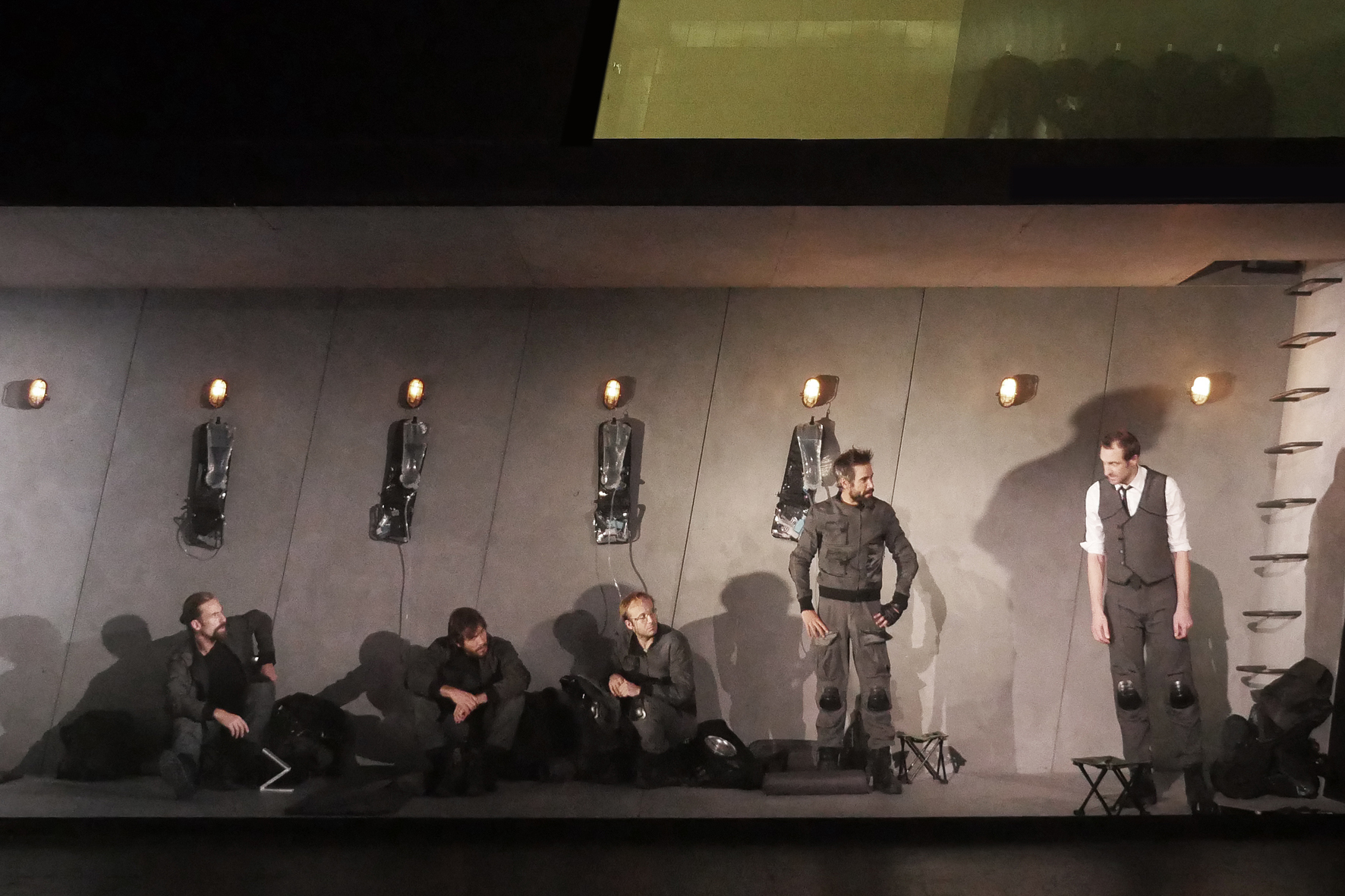 Esta obra de Alfonso Sastre, estrenada en 1953 en este mismo Teatro María Guerrero, a pesar del éxito que ha ido cosechando históricamente, ha envejecido mal, puesto que requiere un contexto con el que dialogar que se ha perdido, aunque se mantengan ciertas pulsiones belicistas ahora reconfiguradas. La versión que presenta Paco Azorín sobre este grupo de jóvenes encerrados en un búnker (sustituye a la casa del guardabosques del original) a la espera de verse sacrificados en aras de una victoria durante la Tercera Guerra Mundial, aporta un cambio que podemos juzgar de trascendental para la interpretación del texto. Hablo del final ─no me queda más remedio que destriparlo─. Alfonso Sastre marcó que Pedro, mientras dice unas palabras, le ofrece su primer cigarrillo a Luis, el más joven e inocente de todos, y luego baja el telón. Sin embargo, Azorín ha optado por una resolución que puede tener múltiples lecturas. El caso es que nos topamos con este chaval, interpretado por Jan Cornet, con una fuerza expresiva que va de más a menos y que definitivamente remonta, se desnuda y sube esperanzado hacia las escaleras que llevan a la salida. Por un lado, podemos considerarlo como una forma de cumplir con las intenciones del dramaturgo cuando a los diez años del estreno señaló: «Y quizá la última escena, lúgubre y resignada en mi obra, tendría ─en una obra mía de hoy─ la forma de una cierta toma de conciencia; y Luis no sería, al final, solo un pobre muchacho que se dispone a vivir su vida como una condena sin sentido…». Por otra parte, lo visto posee casi tintes religiosos, el actor llega a parecer un serafín ascendiendo por la escalera de Jacob en busca del cielo, de la misericordia y hasta de la gracia. Y, si nos ponemos más retorcidos ─y ya que el simbolismo juega un papel tan primordial─, contemplar a Cornet, un tipo con ese aspecto, tan rubito y blanco, nos puede llevar a imaginar a un alemán gritando que sí, que sí, que en la Tercera va la vencida. Por lo demás, Escuadra hacia la muerte, una vez perdidas las circunstancias que lo sustenten, se amalgama en unos personajes que tienden a deslavazarse y a perder una identidad que dramáticamente no llegan a desarrollar. Contamos con cinco soldados y el cabo Goban, que se comporta dictatorialmente en pos de mantener una disciplina que intuimos endeble. Creo que es desacertada la elección de Julián Villagrán para representar este personaje; cuesta imaginárselo en esas acciones tan directivas con sus formas de expresión algo desgarbadas. Lo que sí me parece adecuado es el contraste que se establece entre los personajes que interpretan Iván Hermés, Agus Ruiz y Unax Ugalde, que ofrecen, inicialmente, su fortaleza física y mental, aunándose en una especie angustiosa resistencia, y Carlos Martos, un profesor de Metafísica que, lógicamente, vive atormentado por su cuestionamiento existencial. Sí que es justo reconocer que Paco Azorín se emplea a fondo en la escenografía, su especialidad, y que nos entrega toda una estructura en dos pisos, con varias trampillas, elementos traslúcidos y una estética futurista, aunque sea un futurismo sui géneris, puesto que tecnológicamente no parecen muy avanzados esos militares. Adereza la construcción con el destacable trabajo de iluminación de Pedro Yagüe, tanto en la creación de espacios como en la acentuación de emociones. Casi con seguridad, el director, consciente de que el texto propende hacia un ambiente áspero y lóbrego, ha elegido abrirnos una guía (cada uno de los cuadros se marcan como si fuera una cuenta atrás, atildados con frases a juego de Brecht con clara intención propedéutica) y por musicalizar la sequedad con la que se pasa de una escena a otra, con un guitarreo en la esquina que visualmente desentona y rompe con la cohesión del armatoste. En conclusión, lo que hubiera hecho falta, para que el espíritu antibelicista de esta pieza de Sastre pudiera dialogar con nuestro presente y con nosotros mismos, habría sido una versión libérrima que ahondara en los peligros del terror que nos circundan.