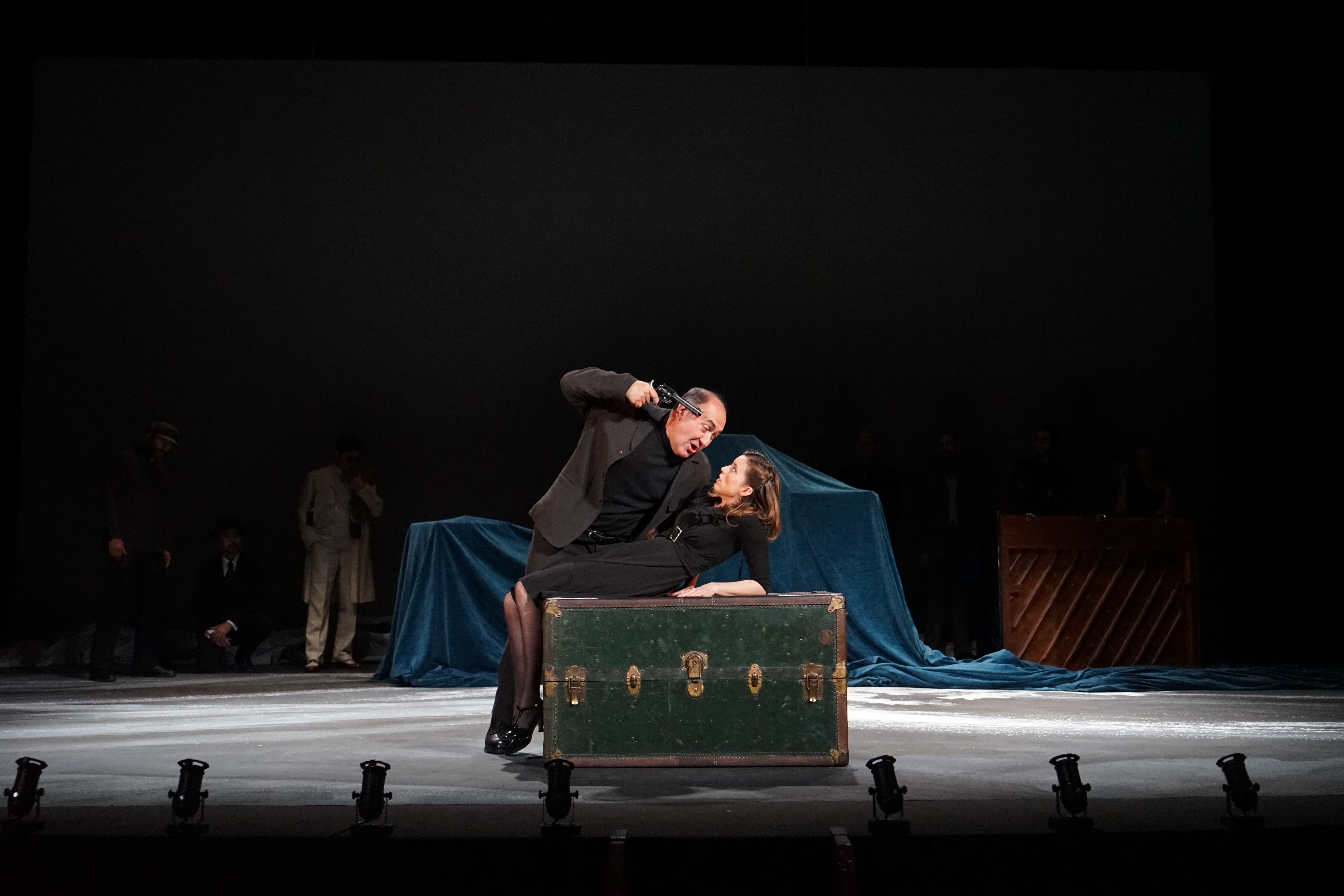 Por las investigaciones de los últimos años parece que el bardo inglés deformó más de lo debido la espalda de nuestro protagonista, abundando en su degradación y ofreciendo razones a su misantropía congénita. Desde luego no es un asunto baladí pasar de una escoliosis aguda a una joroba, un brazo inválido y una cojera humillante. También es cierto que en la versión de Yolanda Pallín, más parece alguien que ha sufrido un ictus o una herida de guerra. El caso es que Arturo Querejeta se echa toda la función al lomo y construye su personaje como si fuera un James Cagney henchido de sadismo, alguien que debe valerse todo lo que pueda de la astucia, de la paciencia y de aprovecharse arteramente de su físico, ya sea para generar cierta compasión, como para pasar desapercibido. ¿Quién se puede imaginar a ese individuo como rey? Eso sí, el asesinato formará parte de sus costumbres cotidianas, pura sicopatía. Ricardo III es la disección del malvado que toma motivo en el mal mismo. No es solo ambición o venganza o ira, es un modo de ser; y esto es lo que nos debe espantar. Resuenan sarcásticas las voces del elenco, como una opereta en la que se insistirá más adelante, con aquello del «sol de York» (un juego de palabras sun/son), ante el cuerpo aún caliente de Eduardo, príncipe de Gales, asesinado por el propio Ricardo (igual que a su padre), en el comienzo de la obra.La ambientación propuesta por Pallín y Vasco remite, por ejemplo, al Chicago gansteril de los años veinte avanzando hasta un atisbo de soldadesca nazi. El expeditivo pistoletazo nos va entregando muertos al antojo del futuro monarca. El sentido y el ritmo está tan marcado por el buen hacer de Querejeta que el resto ve reducida su presencia y su ímpetu. Hasta diez actores le acompañan con una solvencia estimable. Adquiere un tono de patetismo procaz la declaración amorosa a la viuda Ana, que Cristina Adúa acoge con tembloroso encanto, estupefacta ante tal despropósito mientras se apoya en el baúl que simula el ataúd de su esposo Eduardo. Similar escena se repetirá con Isabel, la esposa de Eduardo IV, que Isabel Rodes encarna con el punto preciso de pundonor. Cierra el bando femenino Charo Amador, muy firme como Margarita. En el bando masculino, la cantidad de personajes no permite más que pinceladas a muchos de los actores, entre ellos, podemos destacar a Fernando Sendino, que se ocupa sibilinamente y con expresión certera de Buckingham, ese lugarteniente dispuesto para la sevicia. Antonio de Cos se queda con Hastings, un contrapeso vigoroso. José Luis Massó y José Vicente Ramos se transforman en un par de asesinos voluntariosamente despiadados. Mientras que Guillermo Serrano se tiene que ocupar de Brakenbury, el gobernador de la Torre de Londres, entre otros. Todos contribuyen a dar forma a esta compleja tragedia de tintes calderonianos, donde la predestinación juega un papel importante en la sicología y en las decisiones de estos nobles, reforzada, además, por los sueños, las presencias y las visitas fantasmales. Han pasado justamente dos años desde que Sanchis Sinisterra versionara Sueños y visiones del rey Ricardo III para representarla también en el Español; aquella fue una mirada centrada en lo onírico, mientras que esta que dirige Eduardo Vasco tiende a lo narrativo, reconociendo que el embrollo histórico es morrocotudo si se desconocen los antecedentes; y este hecho provoca que la acción tienda a lo estático y que los parlamentos quieran resolver más de lo debido. Se insiste nuevamente con una escenografía mínima (a cargo de Carolina González), apenas unas maletas, algún baúl, un piano tecleado por Jorge Bedoya, quien también hace labores eclesiásticas. Miguel Ángel Camacho se encarga de la iluminación, asumiendo que no es fácil manifestar la oscuridad intrínseca del villano y, a la vez, la vida que transcurre por detrás de él. Elegante y bien perfilado, sencillo, el vestuario de Lorenzo Caprile. Como ocurre con otras adaptaciones shakesperianas de Noviembre Teatro, como El mercader de Venecia u Otelo, se pretende hacer encaje de bolillos, recortando aquello que pudiera sonar pretencioso, aburrido o abstruso, intentando no perder la esencia y, además, aportándole ciertos detalles esteticistas, aunque siempre mínimos. El resultado sigue siendo el mismo: no se logra la excelencia, pero se obtiene un entretenimiento al que puede acceder un público más amplio y no tan exigente, que podrá salir tras la pertinente hora y cuarenta minutos de rigor habiendo asistido a un Shakespeare.