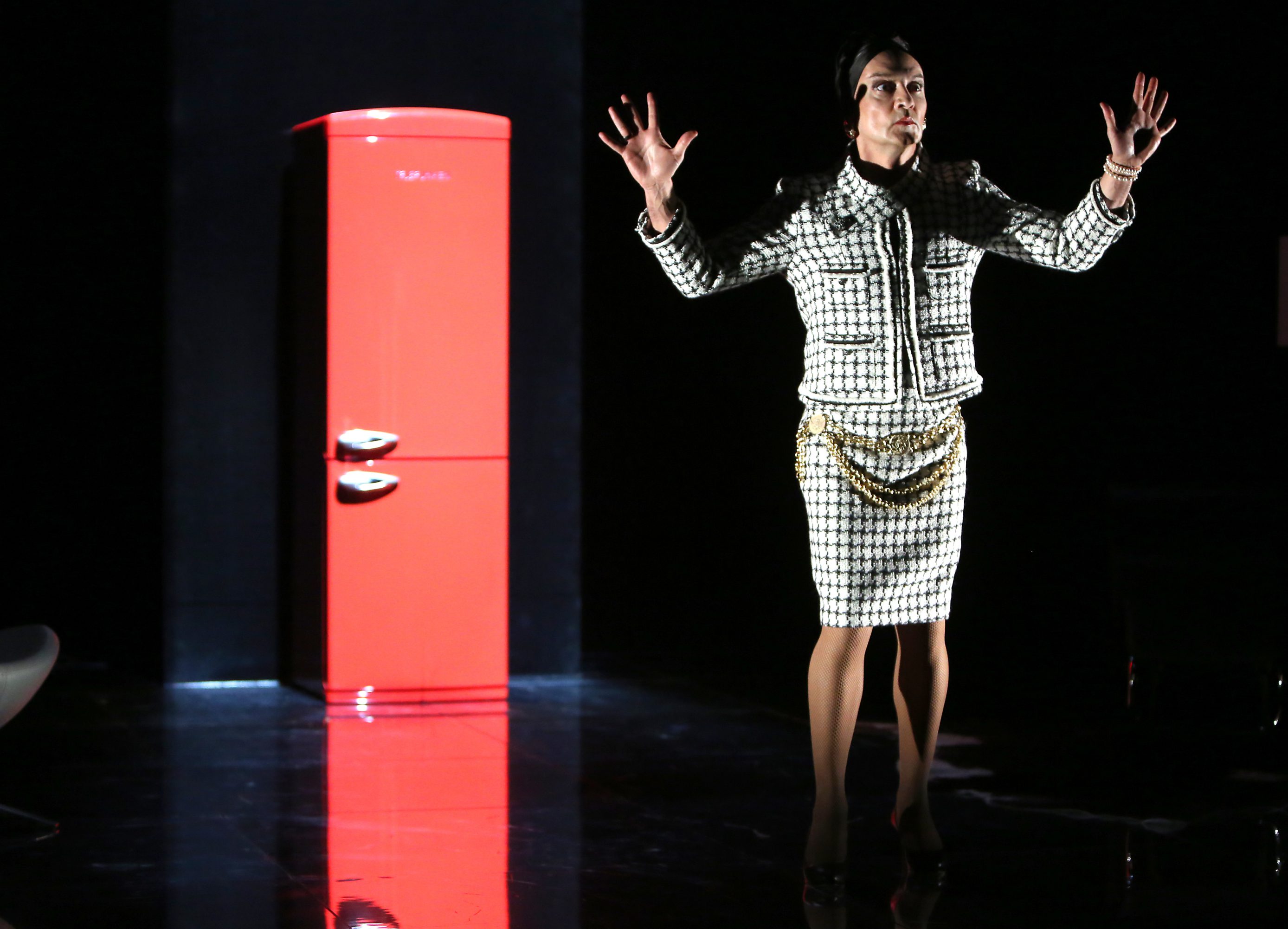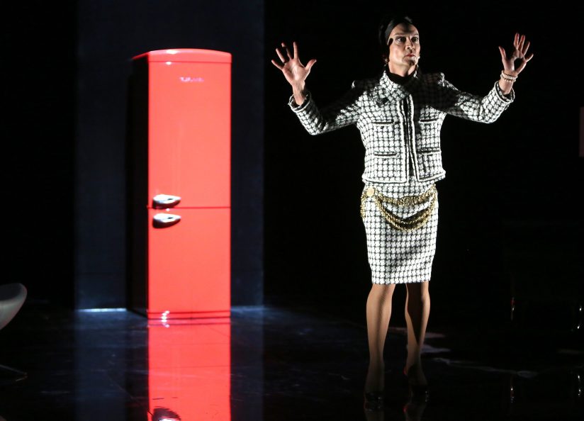 No parece que esta obra de Copi sea ya tan alocada y transgresora como nos la presentan. Tampoco alcanza a ser una sátira suficientemente vitriólica, sino más bien un espectáculo propio del pequeño cabaret, destinado a crear un mundo propio, aunque un tanto trasnochado para nuestros días. Le frigo cuenta la historia de un individuo que aparece travestido de glamurosa modelo envejecida, el día que su madre le ha regalado una nevera. El rojo electrodoméstico vendrá a ocupar un espacio vacío, a representar un elemento de choque, un artilugio patafísico para congelar el tiempo de aquella dama melancólica que está escribiendo sus memorias, resistiéndose a perecer en el olvido como una Gloria Swanson en Sunset Boulevard. A partir de ahí se crea una atmósfera de tipos que entran y salen, de situaciones grotescas y brutales, embestidas por una ironía esnob de autofustigamiento (las violaciones que sufre parecen ser el alto precio por mantenerse viva). Algunos de los personajes, todos ellos representados por Enrique Viana, quien saca a relucir toda su versatilidad y su arte detallista con inmejorable pasión, abren camino al desenfreno, como Goliatha, la sirvienta encofiada, gritona y enérgica que quiere revolucionar la escena; otros, como el detective o el perro, parecen en sí mismos un simple interludio o una grieta de significancias múltiples. Tengamos en cuenta que el texto conlleva características propias del teatro pánico, que aquí se explotan a través de toques más freudianos que surrealistas; ya sea en el personaje de mami, que el mismo Viana interpreta simultáneamente con el protagonista en el clásico desdoble de vestuario y su actuación de perfil, y el permanente intercambio de voces. La modelo arrastrada por su madre como un parásito incapaz de independizarse. O ya sea abundando en lo sicoanalítico, hace acto de presencia la doctora Freud, en esta caso simbolizada por una gran oreja. Al montaje enseguida se le echa en falta mayor dinamismo, sobre todo en la primera parte; y en la enorme distancia con el público en la Sala negra de los Teatros del Canal, que no favorece la comunicación. Los cambios de vestuario son lentísimos, pasan varios minutos hasta que el actor vuelve a salir a escena, mientras nos quedamos tan solo con Zorion Eguilor, un pianista que va tocando varias piezas, boleros y tangos, y que también está travestido, como recién salida del Tropicana. Esos lapsos deberían rellenarse a toda costa; de hecho, no es extraño contemplar otros espectáculos de este cariz donde los actores se cambian fulgurantemente. Esta circunstancia estropea, y mucho, la función. Ese alocamiento que debería tener el ritmo propicio no llega. Es más, la obra se alarga hasta casi la hora y media, cuando podría quedar resuelta en sesenta minutos. Cierto es que algunos guiños de humor negro siguen funcionando, como las alusiones al suicidio; u otros aspectos cómicos sobre la menopausia. Posee, en síntesis, ese aire próximo a las novelas de Manuel Puig; tanto él como Copi tuvieron muchos puntos en común y es fácil que nos caiga en la memoria El beso de la mujer araña. A pesar de que la crítica a la burguesía resulta algo tópica y superficial, posee atractivo y seducción dramatúrgica. Por otra parte, la escenografía de Daniel Bianco consigue estilizar el conjunto; la coherencia en la decoración, tanto el sillón como el diván y de fondo el frigorífico —como un tótem vislumbrando los tabúes que se van expeliendo y que torturan a la señorita— estructuran el espacio con solvencia.