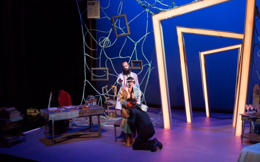 Hoy en día el tema de la memoria continúa siendo un quebradero de cabeza para los neurocientíficos; les cuesta desentrañar de qué manera nuestras percepciones se asientan en nuestro cerebro y de qué forma luego podemos recuperarlas. Uno de los pioneros en este campo —también en otros muchos, como el lenguaje— fue el psicólogo ruso Alexander Luria (1902-1977), el gran heredero de Vygotsky. Pablo Díaz Morilla se ha fijado en la historia del más célebre de sus pacientes, Solomon Shereshevsky, el primer diagnosticado de hipermnesia, es decir, algo así como poseer una memoria tan inmensa que uno se siente abarrotado de pensamientos, de datos, de relaciones. Además, sufría sinestesia, consistente en atribuir a las palabras, a los recuerdos y a sus experiencias, cualidades de varios sentidos, ya fuera del gusto, del tacto, etc. Desde luego, a priori, la biografía de este hombre parece interesante; aunque el montaje posea las carencias propias de las funciones que tratan de llegar a un público amplio. Primeramente, debemos reconocer que la estructura es clásica, lineal y que rápidamente adopta un tono algo naíf, dickensiano, como si el contexto histórico de aquellos años 20 en la Unión Soviética no terminara de permear en un relato que se encierra sobre sí mismo. Se lanzan pinceladas sobre ciertas presiones políticas, escapar del país, la libertad de prensa, etc.; pero el texto quiere ir al grano. Y este sería otro punto a corregir. Se quieren introducir demasiadas escenas en poco tiempo y el teatro no es cine —cierto aire a Capra, también se percibe—. Se confunde el dinamismo, con el ensamblaje abrupto de unas situaciones con otras. Por lo tanto, falta pausa, desarrollo del conflicto en cada diálogo y, también, algo de silencio que nos permita acceder al sufrimiento del protagonista; por ejemplo, vemos cómo el Solomon se convierte en una atracción de circo —en una escena muy repetitiva con petición de aplausos en cuatro ocasiones— y enseguida se cambia de tercio. Estos hechos son los que encapsulan a los personajes, que no terminan de redondearse. Así le ocurre Esther Lara, quien se encarga de la esposa; hasta bien avanzada la función no adquiere suficientes matices, es un tanto pasiva vitalmente. Luego, ya nos demuestra que se pueden ofrecer alternativas y que su padecimiento es igualmente intenso. Luria es encarnado por Steven Lance, un personaje caricaturesco, muy poco creíble, llevado hacia el estereotipo del científico ensimismado en sus cosas, muy sabio; aunque tan descuidado como para olvidar el cumpleaños de su mujer. El actor cumple activamente con su cometido, pero su papel debería mostrar mucha más profesionalidad. Ángel Velasco se mete en la piel de Shereshevsky y logra transmitirnos su desgarro interior, esa desesperación por encontrar la solución. Evidentemente es quien carga con todo el peso argumental de la obra y quien es sometido por sus extrañas capacidades. Digamos, en definitiva, que las escenas donde el protagonista se aproxima a los límites nos parecen verosímiles, mientras que el resto caen en un envoltorio fabulístico sin consistencia dramatúrgica y profundidad sobre los hechos. No hay más que contemplar el epílogo, tan edulcorado y efectista que uno se pregunta si de verdad esta historia merecía la pena. Por lo visto, en la realidad, el tipo terminó trabajando de taxista, cuando podría haber sido un gran reportero. En cuanto a la escenografía, es palpable que entorpece el movimiento de los actores y Fran Perea, en su primer montaje como director, lo debiera haber advertido. Dita Segura y Juan Heras han querido mezclar dos estilos antagónicos y simbolizar el caos cerebral de Solomon con una ocupación excesiva del escenario. Por una parte, tres enormes puertas irregulares, aunque sencillas, que se van iluminando, se pretenden combinar con un despacho, una habitación con su cama y, por el aire, una enredadera formada por cuerdas con marcos colgando. Visualmente no me convence, me despista y deja a los intérpretes sin sitio para desplazarse con soltura, no caminando de lado. Sin embargo, sí que Michael Collis realiza un notable trabajo con la iluminación y atisba con el domino de colores y tonos, lo que podría haber sido un espectáculo más sutil. En conclusión, Souvenir es un espectáculo entretenido, que hará pasar una tarde agradable a los espectadores; pero requiere pulirse. Para ser la primera dirección de Fran Perea, podemos tomarlo como un impulso inicial del que aprender para mejorar en futuras oportunidades.