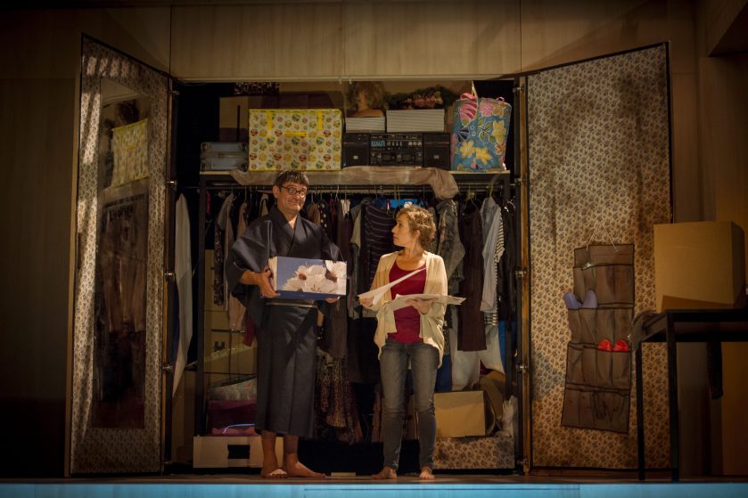 La confluencia de motivos e ideas ha permitido que las T de Teatre se hayan hecho un autohomenaje tras estos veinticinco años desde la creación de esta exitosa compañía. El texto escrito por Marc Artigau, Cristina Genebat y Julio Manrique se configura con una aproximación al thriller, al drama existencial con tintes de comedia; aunque tenemos que reconocer que las dosis de humor son más leves que en otras ocasiones —si recordamos Aventura! o Premios y castigos. Las cuitas personales de las cuatro protagonistas se nos presentan entremezcladas para confluir en un final que nos reconcilia emocionalmente con su devenir. Es precisamente en el desenlace cuando uno puede justificar algunas escenas un tanto anodinas que parecen ocupar un lugar de relleno para que no se descomponga el puzle. Pero si fuera trepidante, perdería la hondura hacia la que nos dirigen. Desde luego, la fantástica escenografía de Alejandro Andújar, un gran cajón rectangular que favorece espacios nuevos y perspectivas inéditas provocando una sensación cinematográfica, apuntalada por los vídeos que se proyectan en el gran frontón superior que ha preparado Francesc Isern, resulta atractiva y provoca nuestra atención. Entre las virtudes de esta historia entrecruzada están los diferentes puntos de vista que se nos plantean. Con Ágata nos encontramos con la veta metateatral, ella hace más o menos de sí misma, de una actriz que pertenece a una compañía que cumple veinticinco años y que ahora se encuentra en la residencia donde debería estar su madre, que se ha escapado para celebrar su cumpleaños. Ágata Roca, con la expresión espontánea de quien interpreta a una actriz en su cotidianidad, se consume en nervios pensando que tendría que estar ensayando; que por fin va a cantar en una representación teatral y que no se le da bien. Piu, un celador encarnado por Jordi Rico, intenta torpemente ligar con ella, hasta elabora un discurso consistente hablando de los pájaros, su verdadera pasión. El fragmento que vertebra, de alguna manera, todo el andamiaje está comandado por Clara, una Carme Pla en plena crisis, inquieta, dejándose guiar costosamente por un peculiar guía espiritual japonés (Álbert Ribalta con el hieratismo zen) que le ayuda a ordenar su vida, ahora que está a punto de operarse de una hernia. Para ello comienzan por el armario, una excusa para preguntarse qué es lo importante en su existencia. Posee este relato tonos oníricos (y psicoanalíticos) y una indagación en el pasado que nos revelará un suceso crucial para la coherencia del desarrollo. El cabo que, seguramente, queda más suelto es el de Lola, una agente inmobiliaria que se reencuentra con Ángel (otra vez Albert Ribalta), un compañero del instituto, mientras le enseña un piso. Rosa Gàmiz se agarra a su madurez esplendorosa para derrochar energía, para ofrecerse vitalista y dispuesta a comerse el mundo; aunque no deje de compararse con Eva, la hija de Clara, que interpreta Carolina Morro con sencillez y bonhomía. Esta representa, evidentemente, la juventud; también esa consabida nueva España de la generación mejor preparada de la historia. Sus veinticinco años son el comienzo de la vida en serio. Finalmente, contamos con el hilo que, en definitiva, nos permite cerrar este entramado. Marta Pérez se mete en la piel de una anestesista que está especializada en la Escala Visual Analógica del dolor (E.V.A.). Su tristeza y su anhedonia constituyen la base de su personalidad. Nos enteramos de que todo su pesar tiene como origen el acoso escolar sufrido cuando era adolescente. La verdad es que resulta bastante reiterativo que se explique el síndrome de Estocolmo desde la misma capital sueca donde imparte una conferencia; o que relate cómo Clara la encerró en un armario durante varias horas, cuando se supone que nos tendríamos que haber enterado con el vídeo que se proyecta. Son aspectos que podrían haber mejorado la conclusión. Por otra parte, algunos encuentros con otros antiguos compañeros (ellas cuatro lo fueron) del instituto son coincidencias innecesarias. Pero hay que aceptar que merece la pena este nuevo espectáculo de las T de Teatre. Que está lleno de pequeños detalles, como el uso de los recursos audiovisuales o acudir al tema «The Logical Song», de Supertramp, para ilustrar el cuestionamiento filosófico, o la canción de Marco Mezquida como epílogo, tan sutil. Completan un montaje compacto y entrañable, hondo en esa espeleología hacia los orígenes; cada una con sus armarios que deben ser ordenados y aireados; y con una mirada esperanzadora hacia el futuro. La circularidad y sus biografías entreveradas nos empujan con tino hacia esa composición orgánica del drama coherente.