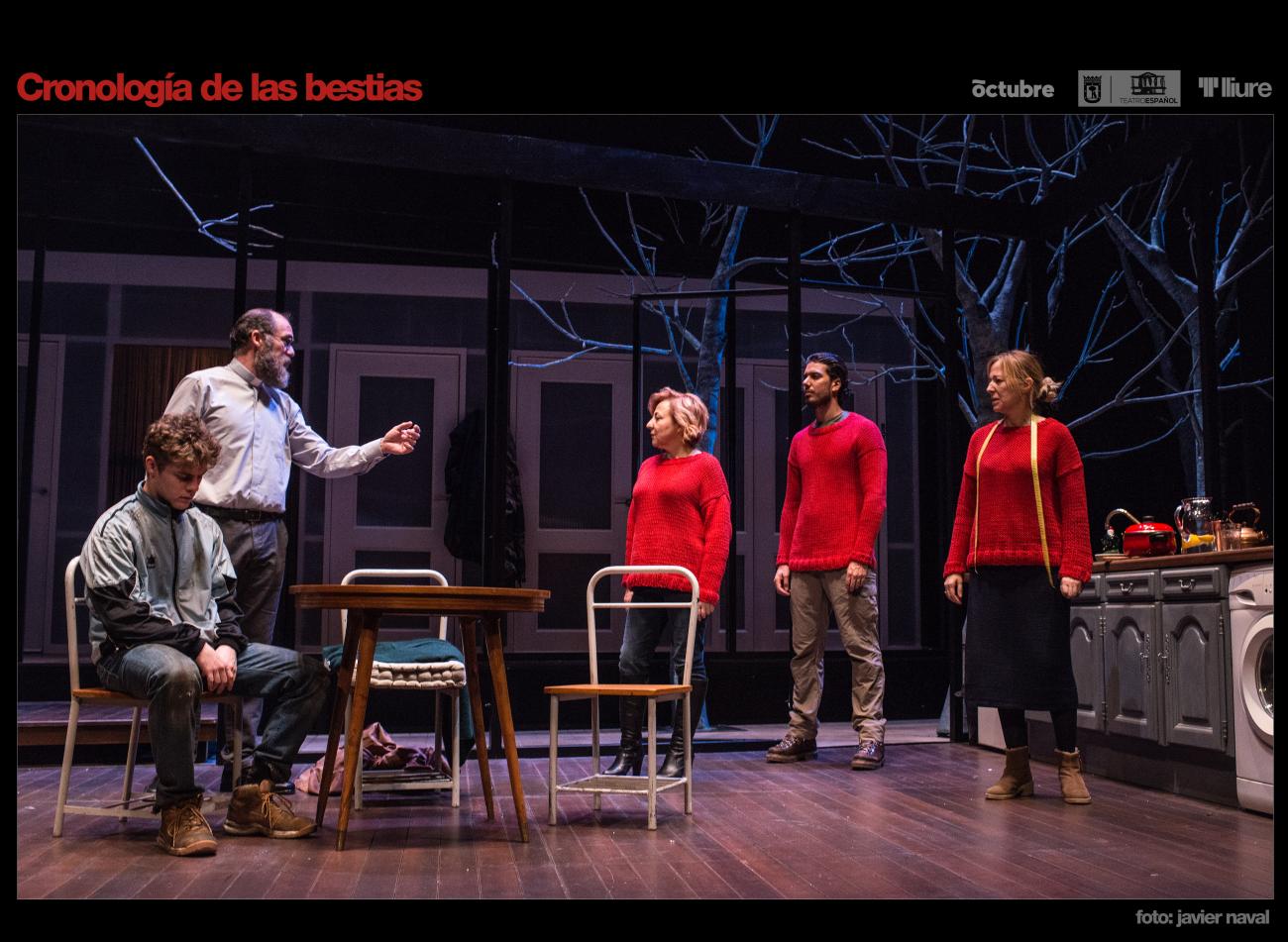 Cuando al principio se crea esa atmósfera extraña y macilenta en aquel hogar creado por la escenógrafa Monica Boromello; donde el espacio protege a sus habitantes —pero a la vez los somete una peligrosa intemperie que se adentra—, es fácil recordar el film La próxima piel (2016) de Isaki Lacuesta e Isa Campo. Aquí también aparece años después (diez) un muchacho que había desaparecido. Beltrán se agazapa tras un sillón con una pistola en la mano. Patrick Criado cumple excelentemente con su papel de joven desorientado, fingidor y, además, furioso al verse envuelto en una especie de pírrica oportunidad para salir adelante. Digamos que el concepto que maneja Lautaro Perotti en la Cronología de las bestias es magnífico; porque nos permite intuir una doble interpretación que se entrelaza. Desde el punto de vista moral, ese chico es casi una epifanía, es una pieza que encaja excepcionalmente en un lugar idóneo para «solucionar» un rompecabezas irresoluble y sufriente. Desde el punto de vista simbólico se pone en funcionamiento la mágica disposición humana para el autoengaño. Por momentos, los hilos de cada biografía se van tensando de forma propicia y equilibrada; aunque en el último cuarto de hora al dramaturgo se le va de las manos y la función se desbarata en un barullo que deja al espectador con la idea de que todo ha sido revelado precipitadamente. Cuesta no destripar el argumento; no obstante, es necesario relatar —los personajes lo irán haciendo, con explicaciones extemporáneas e innecesarias en muchos casos—, que Beltrán solventará las carencias del resto y de sí mismo. Para Olvido, la madre que Carmen Machi encarna con una fuerza mezclada con angustia —hemos de reconocer que en el desenlace se muestra desaforada en demasía—, esta inesperada circunstancia le devuelve a su único hijo. Ya no tiene que «agarrarse» tanto a su sobrino, César, un Santi Marín, poderoso, casi dictatorial, que se dedica a negocios turbios. Para este, el recién llegado supone una coartada estupenda. Por otra parte, Pilar Castro es la tía, la hermana de Olvido, una mujer timorata, con pocas luces, una inocentona que tuvo un hijo con quince años y que manda sobre ella y, de alguna manera, la maltrata psicológicamente. Se entretiene cosiendo jerséis rojos que regala a su familia (fenomenal detalle el jersey de mangas extra largas con el que atar al nuevo inquilino) y ahora podrá recuperar a César. La actriz vuelve a desarrollar su vena dramática, tan honda, con su mirada huidiza y esa voz endeble que cala, cuando es derrotada en los diálogos. Luego, contamos con un personaje que no termia de encajar del todo en esa intermediación entre la algarabía del pueblo y su malidecencia, y sus sospechas ¿fundadas?, con el espíritu viciado de aquel hogar. Jorge Kent se afana con esa solidez que lo caracteriza en ofrecernos un sacerdote empeñado en la conciliación. Resulta extraño que a esta obra que se presenta en el Teatro Español se la califique de «comedia negra de suspense». Es cierto que en algún momento, el tono bronco y algo exagerado que emplea Olvido con su hermano puede hacernos sonreír; pero lo cierto, como ya he afirmado más arriba, es que nos dirige hacia un callejón sin salida que parece mejor que el abismo definitivo por el que estaban cayendo. Se debe valorar muy positivamente la iluminación de Carmen Martínez, pues reconcentra nuestras miradas con claroscuros muy expresivos. En definitiva, Perotti saca a relucir técnicas como los flashbacks recursivos para repetir escenas que producen un efecto paranoico y, a la vez, de arrastre, como si la memoria fuera cabalgando. Aunque le faltarían algunos minutos más para no perder el ritmo y para distribuir la información significativa con un esparcimiento dramáticamente más creíble. Por otra parte, sobran varias frases explicativas que deberían subsumirse al silencio o a la insinuación; porque no todo tiene que quedar definido en esa situación compleja y, ni mucho menos, apelotonarse en la resolución. De qué nos vale comprender el thriller en su totalidad, si lo que verdaderamente es valioso son las reacciones en cadena de los protagonistas, como si un pacto tácito los hubiera destinado a la hipocresía existencial.