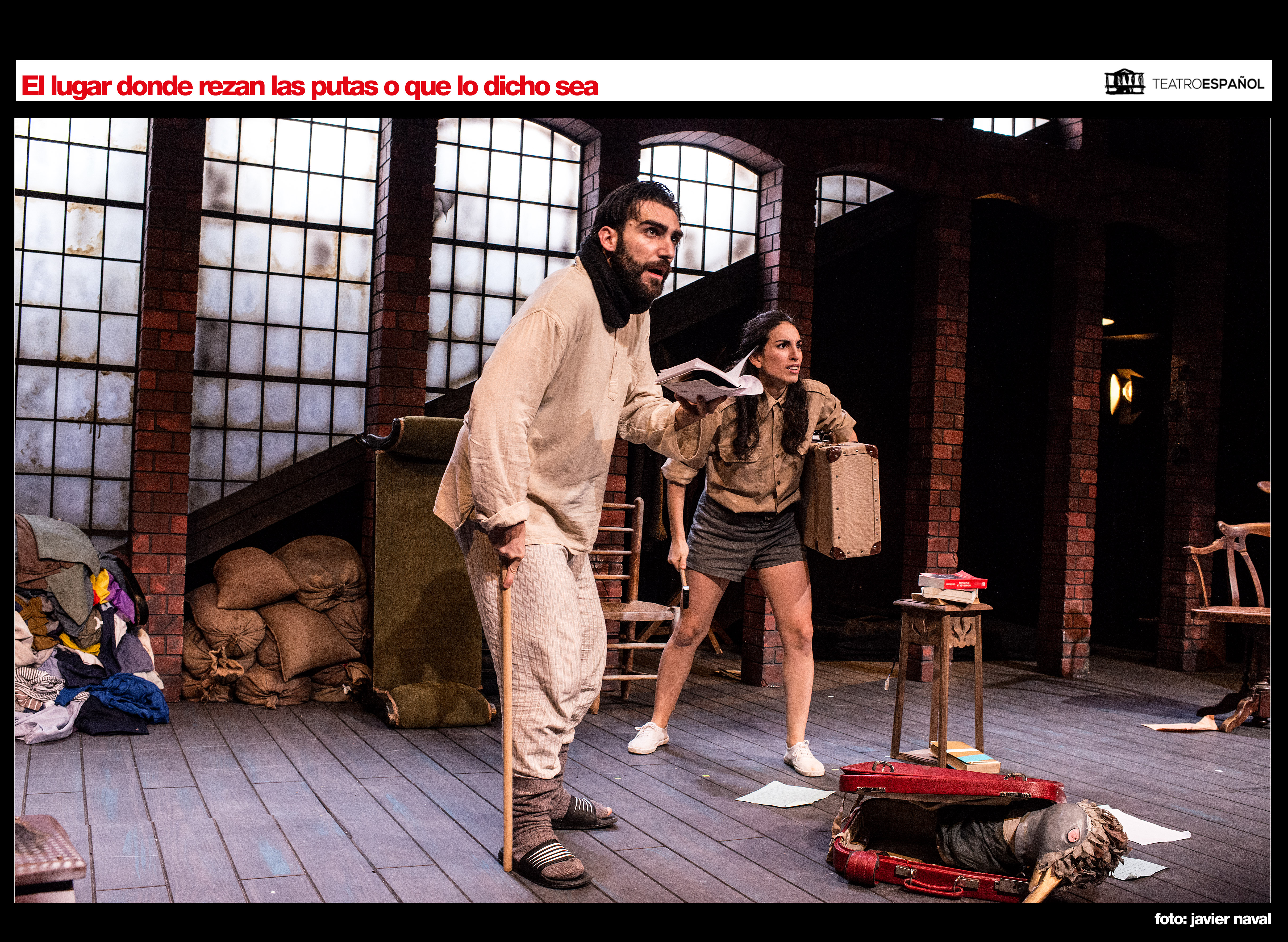No creo que sea conveniente recordar alguna de esas obras de carácter metateatral que en las últimas décadas han poblado los escenarios y de las que el propio autor es uno de sus exponentes. En ellas, ha sido frecuente encontrar a personajes que son actores y que pretenden construir una obra. El teatro en el teatro. Es ya un tópico. A él recurre Sanchis-Sinisterra; pero con un tono entre naíf y descreído que parece lanzarnos al costumbrismo inocente de épocas pasadas. Con elementos humorísticos cargados de inocencia y muy timoratos en la posible actitud crítica (como si hubiera un exceso de prudencia). Paula Iwasaki se queda con Patri, una joven actriz medio ilusionada por las ideas que le rondan en la cabeza. Su expresión aún arrastra una candencia algo dulcificada y cantarina (como si no se hubiera deshecho de la Finea de La dama boba); aunque su energía va encaminada a demostrar su ambición artística. Su compañero, Guillermo Serrano, hace de Rómulo, y se muestra un tanto contrariado, con una leve excitación sobre los dos temas a los que finalmente han llegado y sobre los que tendrán que decidir. Charlan, discuten, auscultan el espacio polvoriento y repleto de cachivaches; no obstante, sin ese aspecto dramático que nos sitúe antes dos individuos envueltos en profesionalidad y en responsabilidad ante un reto en el que se la juegan. En definitiva, treinta minutos de prólogo tedioso en el que ni se desarrollan los personajes, ni tampoco el contenido que se supone primordial; puesto que el dramaturgo da la impresión de querer despistarnos con cuestiones tangenciales hasta que nos topamos casi con el desenlace. Se lanzan propuestas sobre la filósofa Hipatia y su discípulo Sinesio, y, también, sobre Artur y Lise London. Todo ello en una especie de almacén abandonado al que según dicen antes acudían las putas a rezar. Juan Sanz se ha esforzado en crear un espacio naturalista, trufado de detalles y de recovecos que permitan imbuirnos en una situación creíble. Si el cariz era de comedia ligera y suave, se le van añadiendo gestos de fantasía; pues los espíritus que por allí pululan tienen algo que decir y necesitan cuerpos que poseer. Así que dicho y hecho. Con la función inmersa en un tedio inconsecuente y un rumbo que cuesta verdaderamente atisbar; se llega al que debemos tomar como destino y que sería dar voz —que no representación— a los olvidados y marginados, que emiten —en off— sus quejas y agravios. ¿Cómo hemos llegado hasta ahí? Pues en un proceso sin el más mínimo interés. ¿Qué contexto ha perfilado el dramaturgo para dar coherencia a esos fantasmas? El que cada espectador desee poner según sus pálpitos políticos. El lugar donde rezan las putas es una obra desconcertante, porque se demora de forma insulsa desde el inicio. Los minutos pasan y nada de lo que ocurre nos dirige a un cometido razonable. Uno se interroga sobre qué habrá querido contarnos Sanchis-Sinisterra; pero de las preguntas que él mismo ha escrito en el programa de mano: «¿Qué teatro hacer en este aciago siglo XXI?», «¿Espectáculos de puro entretenimiento, que aumenten todavía más “la modorra política de nuestra sociedad consumista y cibermema”?», seguro que nadie dará, visto lo visto, unas respuestas trascendentales. Reclamar utopías que no fueron como el comunismo o el republicanismo. Añoranzas diversas que se esputan en un espectáculo que se anquilosa y que se vuelve estático y al que deberíamos atender profusamente; sin embargo, algunos ya estamos para entonces fuera de la onda; porque con pinceladas de aquí y de allá no se puede uno poner tan serio. En conclusión, aunque los actores se afanan en ofrecernos un montaje fértil; me parece un texto fallido en estructura, en intención y en tono.