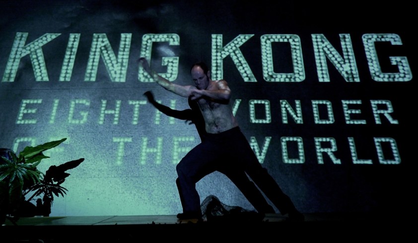 Pensar que en el mero collage y en el aparataje del teatro objetual más un programa de mano con proclamas de carácter teórico-político ya es suficiente como para elaborar una obra que trascienda los lugares comunes del pensamiento anticapitalista, es redundar en la vaciedad del arte conceptual. Recuerdo con verdadero deleite su proyecto A House in Asia, porque concentraban sus esfuerzos en dirimir la «verdad» en aquella famosa operación de captura sobre Bin Laden y sus consecuencias morales. Pero es que Kingdom me parece una pantomima que no focaliza, en absoluto, sobre los desafueros de la United Fruit Company o lo mecanismos de la tercera revolución industrial. La Agrupación Señor Serrano se dedica a hacer el gamberro durante poco más de una hora con su habitual parafernalia videográfica, para no ofrecer la más exigua crítica sobre aquello que, en teoría, quería enjuiciar. La máscara de la ironía posmoderna aquí se antoja cobardía, complacencia y satisfactorio divertimento (tanto para ellos como para ese público sin la más mínima preocupación por indagar en el trasfondo del asunto). Mutatis mutandis puedo afirmar lo mismo que sostuve sobre Lehman Trilogy ―que curiosamente se afincó al en el mismo escenario verde de los Teatros del Canal―, es necesario ser más incisivo y evidenciar, entre tanto jolgorio, las acciones precisas de Minor Cooper Keith, como uno de los fundadores del sistema mercantil contemporáneo, a partir de la explotación bananera. Lo cierto es que predomina el embalaje y la performance satírica como si fuera una revista pulp. La estructura es evidente y clara: una introducción declamada por Pablo Rosal para recordarnos («la humanidad ha conseguido un progreso social sin precedentes»), como si no quiera creérselo, que «estamos bien» (al menos nosotros). Seguramente de lo mejor es el extenso rap de Wang Ping-Hsiang, toda una mezcla de invención y de especulación sobre el génesis bíblico (sobre la pantalla en una creación en directo, el cine-en-tiempo-real) para establecer dos vectores: que tiene más sentido imaginarse un platanero y el plátano como fruta prohibida y que desde los orígenes la virilidad (la matraca también de estos con el patriarcado) se impone como un elemento destructor. Plátano y pene van de la mano con Freud (PPF). A partir de ahí comienza el cachivachismo artesanal con los videomontajes de in situ de nuestros actores con el apoyo musical de Nico Roig, quien también colabora en la actuación, y la videoprogramación de David Muñiz, platanista igualmente. Pantalla grande para realizar los malabarismos ―muchos de ellos altamente ingeniosos y humorísticos―, con estética publicitaria tan bananera como vintage. El tren amarillo irrumpe por la selva de Costa Rica en el inicio del emporio. Datos enciclopédicos para que nos hagamos a la idea de la importancia económica del consumo de plátano a nivel mundial. Salpicadito histórico de plagas, de imperialismo, de colonialismos. Y ausencia de las perversas actuaciones de la industria bananera en los países caribeños y el sistema de esclavitud con el que procedieron; a partir de arrasar con multitud de recursos naturales (lo frecuente en estos casos y que no está de más recordar). Diego Anido busca a King Kong y él se postula como un musculitos henchido de testosterona. Fotitos de presidentes americanos y de otros lares. Y que cada uno se haga composición de lugar sobre el tema a tratar; porque poco más se procura. Metáfora tan escueta como insuficiente. No es elipsis para inteligentes, es timidez por señalar. El sistema capitalista puede dormir tranquilo si desde el arte dramático se le intimida de esta manera. Fin de fiesta con una banda de maromos que aparecen de improviso para deleitarnos con una haka maorí discotequera, estroboscópica y virulenta como epítome de esta economía de mercado que actúa como un mono gigantesco pisoteándolo todo. Aplausos, desde luego. Se quedarán de un pasmo los que esperen remover sus neuronas con este espectáculo de fuegos artificiales apoyado económicamente por una buena ristra de instituciones sostenidas con fondos públicos. Es lo que se conoce como el (anti)capitalismo haciéndose cosquillitas en la barriga.
