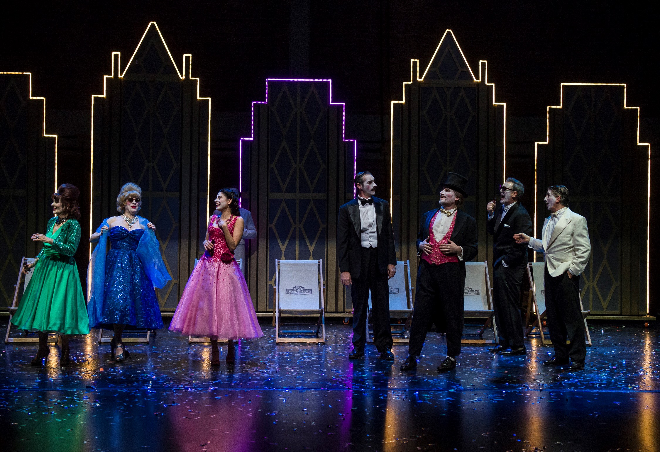 Sinceramente, el tema, contando con el prólogo, se alarga en demasía (más de dos horas). Tengamos en cuenta, también, que se incluyen varias canciones tradicionales napolitanas, tarantelas, que suenan con buen gusto, interpretadas por Santiago Sirur, secundado por un trío de músicos. Y eso que el ritmo que le imprime Pasqual es excelente y apenas decae en algunas transiciones. El humor levemente irónico permea la acción y, ante todo, el elenco argentino se muestra ducho en estos avatares tan fantasiosos. Destaca, por supuesto, Marcelo Subiotto, a quien la temporada anterior disfrutamos con su interpretación en Encuentros breves con hombres repulsivos. Aquí se enmascara de profesor Otto Marvuglia, un ilusionista, que se dedica a tan desencantado oficio en el Hotel Metropole, en 1950 (según la adaptación). Va acompañado de su esposa, una Pata Echegoyen, que aún seduce entre sus creíbles enfados. El tipo es capaz de improvisar respuestas insensatas para las preguntas más que insolentes. Un embaucador apabullante, repleto de energía y abocado a sostener sus mentiras hasta las últimas consecuencias. El burlado doble de este asunto será el celoso Calogero Di Spelta, que Pablo Mariuzzi va transformando hasta el patetismo del enfermo. Observará cómo su mujer desaparece durante el espectáculo al introducirse en un sarcófago y terminar, según le «han sugestionado», en una caja acristalada. Creer o no creer. Abrirla o no. Aguantar el rictus, mientras se ríen de él. Pues ella ha escapado en la lancha de un efebo musculado, que Ignacio Sureda, caricaturiza. Luego, tras cuatro años volverá Marta, una Yanina Gruden, que tiene poco papel para demostrarnos sus habilidades. A ellos se sumarán, entre idas y venidas, los cómplices, Sr. Zampa, que acoge Pablo Razuk, y Gervasio Penna, con Nacho Gadano; ambos listos y precisos para aumentar la confusión. No faltan las damas Elvira Onetto y Alejandra Radano que resultan algo estrafalarias. Sus rostros pintados de blanco, en ese afán que tuvo el autor de recuperar los efluvios de la Commedia dell’Arte, se adentran también en lo estrafalario ─así ocurre cuando, al final, aparece la familia de Calogero─. Además, observamos una decadencia y una melancolía que, de alguna manera, introduce seriedad en ese trajín. Ayuda, indudablemente, la escenografía de Vanesa Abramovich, que trabaja con diferentes paneles que giran para situarnos en el esplendor hotelero y en los rudimentos de las bambalinas.