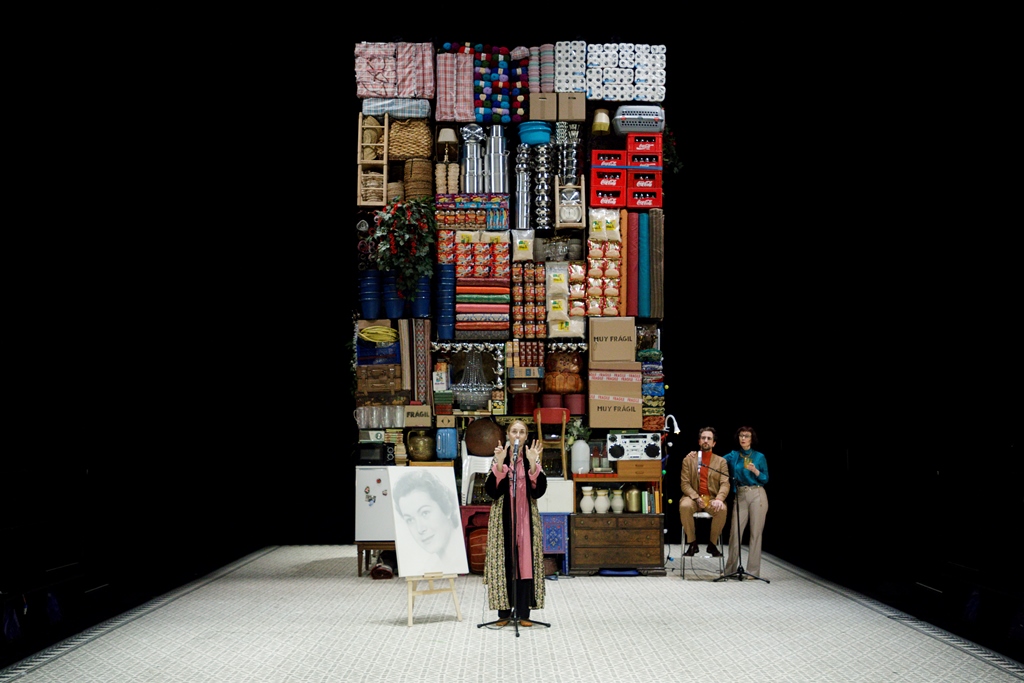 Pienso que Lucía Carballal trenza de nuevo otro gran texto, que nos retrotrae, por su ajuste estructural y dramatúrgico, a Una vida americana, pues, desde mi punto de vista, se había bajado peldaños con Los pálidos, que también exhibió en el Teatro Valle-Inclán. Ahora, en la sala grande, discurre con verdadera consistencia entre los tópicos consabidos que exigen las relaciones maternofiliales, y un sentido del humor judío que nos recuerda a las mejores películas de los hermanos Coen o a esa veta intelectualista que solía incluir Woody Allen en algunos de sus films. Ironizar sobre uno mismo desde la derrota del superviviente. Así recalca en su escenografía Pablo Chaves el amasijo de objetos, un zoco ordenado en una torre prismática, para un pueblo nómada a su pesar. Resulta claramente impresionante y simbólica. Según sacaban cacharros me imaginé una enorme jenga (el juego) derruyéndose sobre todos nosotros.