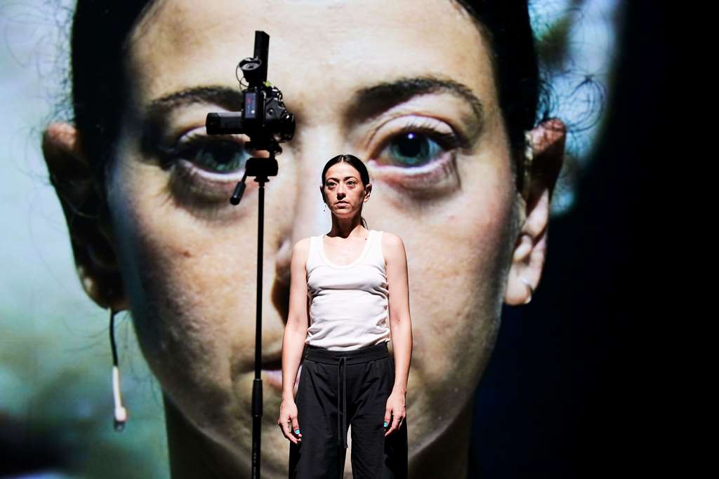 Al principio, la cara gigantesca de Anna Pérez Moya aparece en la pantalla. Emociones en sus ojos, en sus carnosos labios: la sorpresa, la estupefacción, el gusto, el placer, la pena… En algún momento, recordé la portada de Tan poca vida, de Hanya Yanagihara, la foto de Peter Hujar, Orgasmic man, que se aposenta en librerías desde hace años. Remarcar los gestos es, a mi parecer, un buen comienzo, una aproximación desde cero hacia un territorio ignoto. No obstante, resulta paradójico que se discurra sobre el amor con una solitaria performer. Cuesta asumir la vivencia del amor sin los otros. A partir de ahí tendremos que escuchar sus corrientes relatos desde la prehistoria, con la exposición de esas muestras rupestres extraídas de la Cuevas de las Manos, pasando por una búsqueda de El Dorado, a través de la selva, para verse atiborrada de desierto. Me vino la cabeza La mujer de la arena, aquella película de Hiroshi Teshigahara. ¿De qué nos está hablando esta chica con esa ilusión en la mirada? Si hemos de acudir al cursi romanticismo caeremos en una escena bastante ridícula donde unos cristales son pringoteados por pintura en una vitrina circular y giratoria. Algo kitsch, de saloncito francés. Por el camino habrá una parada en el mundo clásico, en el contacto con efebos, para desembocar en un jueguecito con el público, pues con una fotografía al respetable se empastará un cuento más en nuestra contemporaneidad.