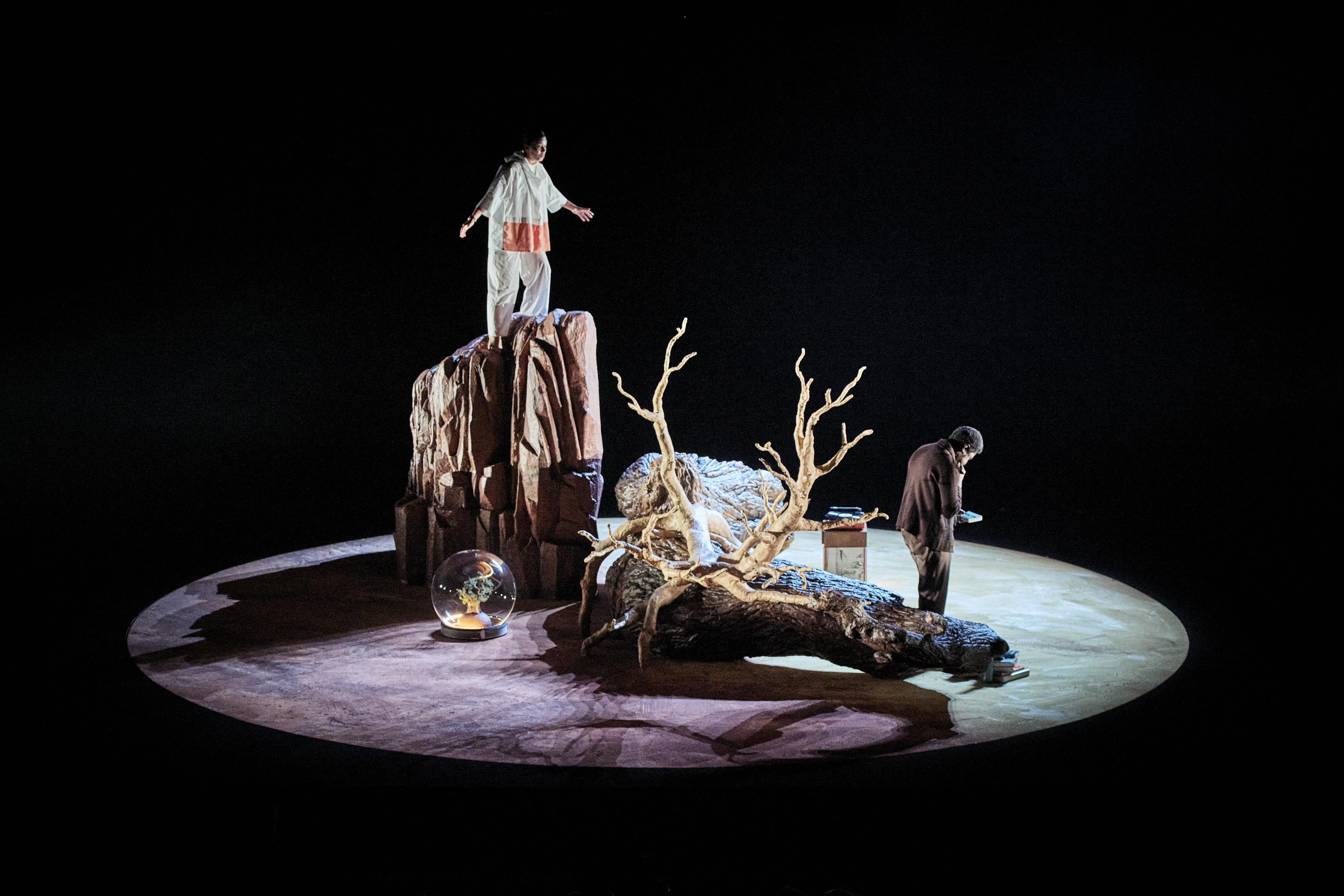 Estamos en el 2077, la escenografía presenta un círculo giratorio con una gran rama caída, unas rocas y, sobre todo, un par de elementos que simbolizan el embate que vamos a presenciar. De un lado, el tocadiscos del que sonará «Sonhos», de Caetano Veloso, como el último recurso para apelar a la nostalgia profunda, a la saudade imperiosa. De la otra parte, un pequeño terrario con plantas dentro de un domo de cristal que representa alguno de esos proyectos de investigación científica como producir aceite de oliva. Toda esa plataforma tendrá una gran importancia en el desarrollo del montaje, sobre todo cuando amplíe su velocidad y consuma los días que restan hasta que esa viajera del espacio pierda definitivamente la memoria de todo aquello que la constituye como persona: sus recuerdos, sus experiencias, sus vínculos familiares, no así sus competencias técnicas, sus estudios concretos de las diferentes disciplinas que deberá emplear. Una reeducación en ese planeta rojo, otro intento más de revolución cultural; pero esta vez comandada por las nuevas corporaciones todopoderosas y no por un partido comunista. Borrón y cuenta nueva. Tabula rasa. Volver a empezar sin recurrir a la historia. Ir contra cualquier ideal absoluto hegeliano. Imponer el positivismo lógico; no obstante, con las ínfulas tecnocráticas y totalitarias, donde no faltarán los sacrificios humanos en pos de unos bienes superiores. Todo esto lo vamos sospechando, pues es una información que se entrevera de una manera un tanto rácana. Para mí, es la mayor falla del texto; pues verdaderamente merecería una profundización mayor en temas de calado político. Dar por supuestos los tópicos de las distopías no logra conectarnos suficientemente con los procesos en los que ahora estamos inmersos, ya sean los propios viajes a planetas cercanos y su colonización, o cómo está transformando nuestra conciencia la IA. En cualquier caso, Alison Dechamps recorre, desde el entusiasmo pionero, en su convencimiento de que esa secta de los olvidantes son los iluminados que han dado con la clave del progreso, hasta las dudas previas a su desconexión total, una gama de sensaciones ofrecidas con sutileza. Es cierto, que, a pesar del movimiento permanente, los intérpretes ofrecen cierta pasividad. Su diálogo podría estar perfectamente configurado por audios. Son sus formas de expresión en la voz las que nos permiten acceder a su extrañeza.