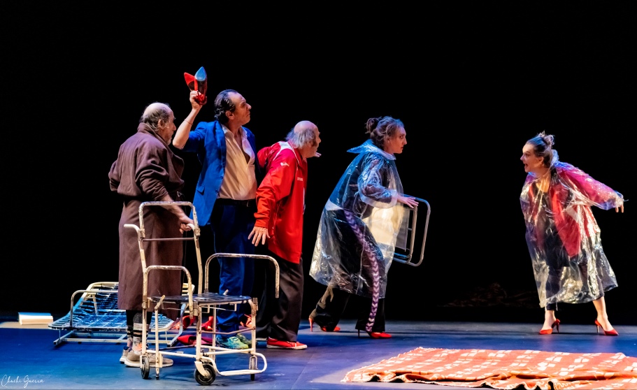 Se antoja menos intensa esta propuesta de La Zaranda, si uno echa la vista atrás y revisa otros de sus proyectos. El eco de aquellos mendigos en Ahora todo es noche reverbera aquí, aunque con un discurso más atemperado, sin tanta enjundia política ni literaria. Incluso si acudimos a El grito en el cielo, aquel trabajo que redundaba en los estragos sociales de la vejez podremos comprobar que se percutía con más insidia. En este proyecto nos destinan a los bajos fondos, al ambiente prostibulario que aún hoy podemos encontrar en las grandes ciudades españolas como Barcelona y Madrid. La cuestión es que el texto de Eusebio Calonge, que nos tiene acostumbrados a concitar una serie de símbolos que le permitan crear una cosmovisión, reduce los discursos con apenas un par de apuntes. Esto lo observamos en el empleo de mamotretos, tochazos polvorientos que se abren y se cierran. La sabiduría, la cultura, el conocimiento aquilatado queda inane frente a la miseria, y ajeno a las propuestas políticas de cada ayuntamiento. Por ahí transcurre una de las claves del montaje, la evocación de Dostoievsky, que aquí funciona como una doble ironía, por un lado, cuando el hampa cree escuchar «¡agua!» (para salir pitando) y, por otra parte, para redundar en la idea beatífica de El idiota, su célebre novela, donde la bondad termina por convertirse en la derrota del cándido. Idiota es aquí uno de los protagonistas, interpretado por el propio Paco Sánchez, que lleva su papel al extremo. Temblequeando, como el epiléptico príncipe Myshkin. Lo que ocurre es que tenemos a un ser incapaz, anclado en el desvarío, ido; porque su mundo de los libros ya no vale ─o nunca ha valido─. Los personajes que pululan a su alrededor son también ficciones que nos deben conmover. De esta manera se presenta Gaspar Campuzano, recién salido de la cárcel, listo para reintegrarse en su hábitat natural, preparado para emprender su oficio de proxeneta. Se maneja con ímpetu guiñolesco en contraste con su compadre obnubilado. El tal Virgilio, que nos guiará por los vericuetos dantescos y prostibularios. Y es que el negocio marcha y el chulo que acoge Enrique Bustos, con esa suficiencia tan desagradable, se ve en la tesitura de ampliar la franquicia. Hombre vitriólico y violento, un deshumanizador que tiene a ese par de trabajadoras del sexo en el maltrato permanente, en la cosificación suprema. Ingrid Magrinyá, que hace de Micaela, una mujer rumana, expresará su pesar a través de la danza recargada en la complexión de las extremidades, como un esqueleto fútil, del movimiento de cuerpo mancillado, como un último aliento. Igualmente, su amiga de penurias, La Alacrana, nos dejará a Natalia Martínez en el grado sumo de la degradación.