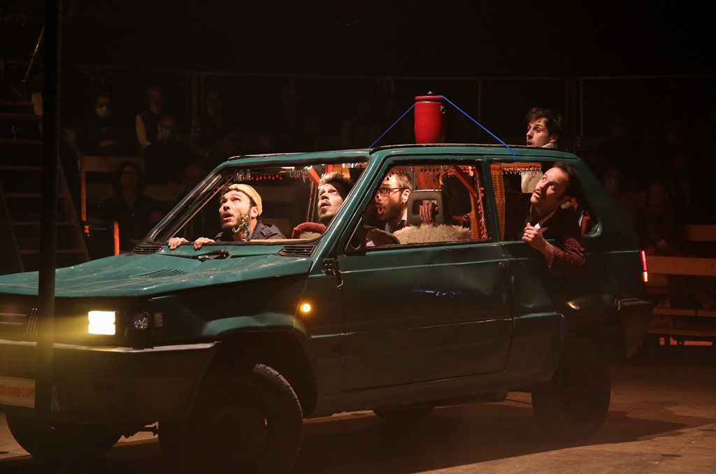 Cirque La Compagnie nos montan en su Fiat Panda para ejecutar sus números acompañados de un grupo musical