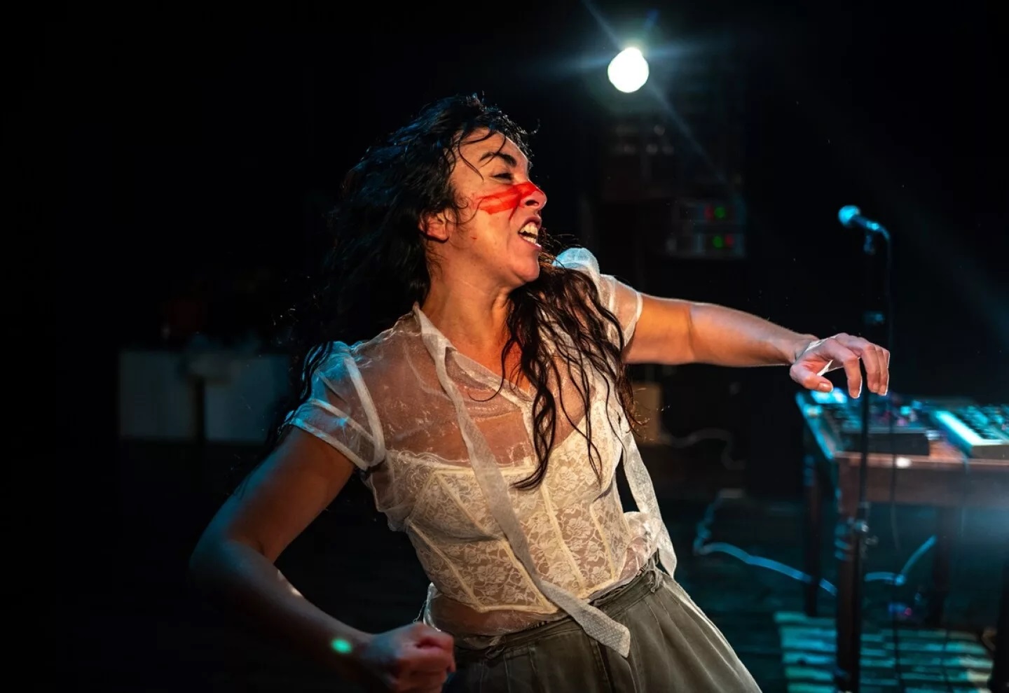 Trentini se emplea con energía creciente y se impone el personaje ─tímidamente esbozado─ de una «perra cimarrona». Quizás pueda llevar a equívoco el término, pues aquí se refiere más a un tipo de perros que pululan por Uruguay y que son emblema de coraje. No se deriva hacia los célebres cimarrones, esos esclavos negros rebeldes que, además, popularizó el cine. También, de hecho, hubo líderes cimarronas y, por lo tanto, podemos conectar el ímpetu de la escena con aquellas mujeres como Queen Nanny. Lo que nuestra actriz anhela es la venganza, la aniquilación de todos aquellos a los que hace referencia. «Morderlos y degollarlos», pues su rabia es imparable. Esos gestos son los que más pujanza tienen dentro del proyecto.