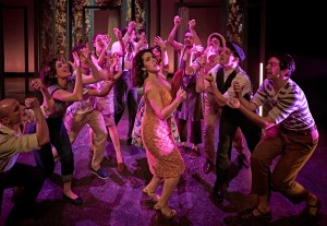 Ciertamente, no hay nada más; aunque sí hay algo menos, y son los bailecitos. Esto no es La La Land y el elenco —no sé quién ha pergeñado la coreografía— pues no sale muy airoso. Claro que algunos tienen más ritmo; pero a otros (me ahorro los hombres, quiero decir, los nombres) directamente carecen de dotes. Que sea una comedia desenfadada no quita para que, si no se puede acometer cierto número musical, pues no se acometa. Luego, está la escenografía que, para representarnos el abril y el mayo, y los paseos por el parque, pues resulta que Arturo Martín Burgos ha decidido que todo el colorido que suponemos que brota en esa pantalla del fondo, este velado durante toda la función y lo que percibamos sea un blanco ceniza. El colorido —absolutamente necesario— sí que sobresale en el vestuario idóneo y muy cuidado de Almudena Rodríguez Huertas. Principalmente, resultan muy vistosos los modelos que luce Ana Varela, con una sobrefalda florida que combina con elegancia con el sombrero que le sirve para ir de «tapada» en sus coqueteos.