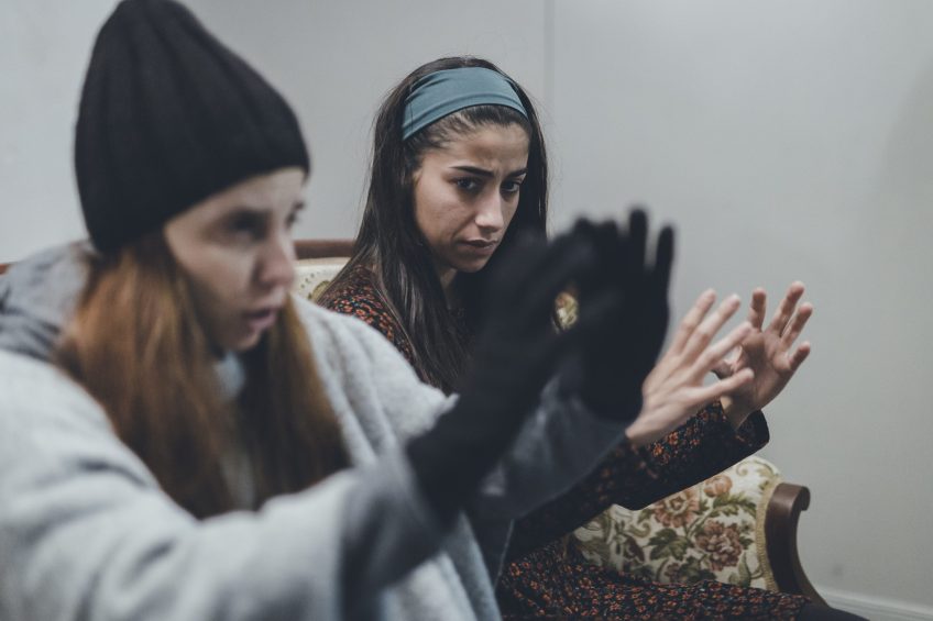 Cuando un accede a la Sala Tirso de Molina, en la quinta planta del Teatro de la Comedia, ese espacio que puede ser alucinante; pero que no deja de ser una moderna caja escénica para un centenar de espectadores, uno es recibido por los intérpretes, que pululan, vestidos de negro. Somos agasajados con unos auriculares inalámbricos que ya transmiten voces que nos confían los ensayos, las maneras de recitar, como si escucháramos esas fanfarrias de calentamiento antes de un concierto. Que nos ofrezca una «hostia» con el mensaje «Usted está aquí» para ese ejercicio de supuesta comunión, para que, al comerla, se nos recuerde que «ahora está en ti», es un pequeño gesto que nos da esperanza sobre el alcance de algún tipo de confraternización teatral. Sigue leyendo →