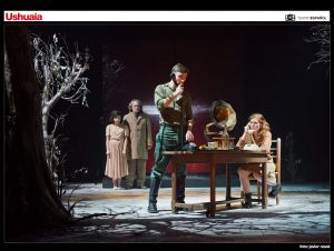 Sí que tiene primeramente mayor protagonismo Emma Vallejo, pues va hablando y traduciendo a su amiga. Será ella quien dé comienzo a esa función dentro de la propia función con esa presentación que anteriormente comentaba: «Señoras y señores: No voy a abrir el telón para alegrar al público con un juego de palabras». A partir de ahí, tenemos todo un engranaje teatral. Guiñoles, teatro de sombras, accesorios, vestuario alusivo para identificar a todos los personajes que van a incluir, ya sea un sombrero rojo para Leonardo o un pañuelo verde para el novio, más toda esa imperante gestualidad. Inicialmente, los pupitres nos descubrirán recortables que cobrarán vida para introducirnos en la historia.