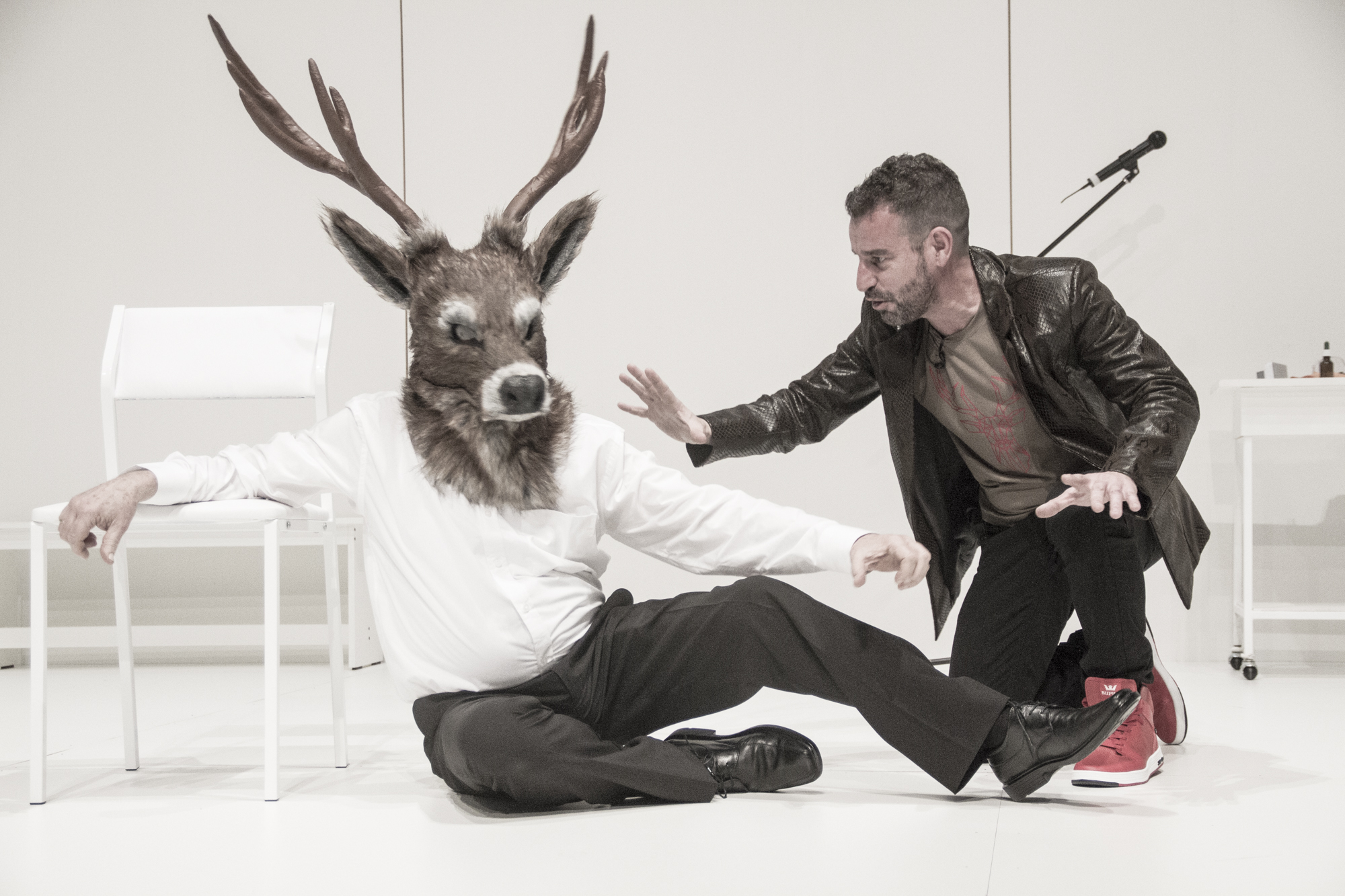 ¿A quién le importa la vida de Sergio Blanco? A Sergio Blanco. Un dramaturgo que miente mal sobre sus mentiras verdaderas en la ficción real. Sencillamente, porque el eterno juego de la autoficción, de la heteronimia, de la metaliteratura, del metateatro, debe contribuir a una experiencia revitalizadora para el espectador; o, si no, para qué tanta mandanga sobre un yo que no tiene mucho de extraordinario. No vamos a hacer el recorrido sobre los ínclitos del motivo ―si nos quedamos en la patria, podemos empezar por Cervantes, terminar con Sergio del Molino (La hora violeta y La mirada de los peces), pasando por Unamuno o Vila-Matas o Sánchez Dragó y sus «japonesitas»―. Desde luego, existen dramas con tintes autoficcionales (véanse los montajes de El Brujo) y otros que se basan en el ego, en el egotismo, en la egolatría, en el egocentrismo, que es el caso que nos compete. Después de haber contemplado El bramido de Düsseldorf, Tebas Land me parece mejor de lo que me pareció entonces. Centrándonos en el asunto, lo primero que cabe destacar es que nuestro autor quiere ser el rey de la autoficción, por eso cada poco, como si fuera un niño pesado, te insiste con eso de que la verdad y la invención se imbrican, y para ello establece permanentes intercambios entre el actor y el personaje. El efecto, humorístico a la postre, se diluye en su reiteración. Si Sergio Blanco conviviera entre nosotros y fuera un tipo famoso del que tuviéramos noticia de vez en cuando, entonces, lo verdadero se pegaría inextricablemente a lo real y el espectador se convertiría en un voyerista o en un cotilla. No creo que nadie se vaya a su casa a intentar descubrir si esto o lo otro es cierto. Debe ser un plus eso del «basado en hechos reales». Es cierto en cuanto ficción dentro de un teatro. La autoficción, en este sentido, es ficción. Empezamos con una captatio (benevolentiae) a ritmo dance, con el tema «Prayer in C» del dúo francés Lilly Wood and the Prick, remezclado en 2014 por el dj alemán Robin Schulz. Bailoteo del elenco, chichisbeo del público invitado (a toda esta gente la he visto yo en otro lugar o, incluso, en el mismo. Será autoficción). Hay que animarse. Luego tendremos más canciones extraídas de M-80 (ahora Los40 Classic). Karaoke con REM. También Haendel y su Mesías, en el instante luctuoso. Para que el personal no se pierda, nos introducen el argumento como a la antigua usanza (como se hace en las funciones escolares). Sobre todo es para insistir y requeteinsistir en que ellos son ellos y no son ellos; pero que sí. El veterano Walter Rey inicia ―micrófono en mano― las presentaciones, un comentario desenfadado sobre la biografía de su compañera Soledad Frugone y los papeles que va a representar. De igual forma hará ella sobre Gustavo Saffores, quien se ocupará de manera distanciadora del propio Sergio Blanco. A partir de ahí, el hilo conductor serán los últimos días de la vida del padre tras un ataque al corazón durante su estancia en Düsseldorf. Sin demasiado ensañamiento en cuanto a la pesadumbre y a la trascendencia del momento. El espectáculo se ve salpicado como un collage por retales de turismo e informaciones de la Wikipedia, ya sea la referencia ineludible al asesino Peter Kürten, popular gracias a la magnífica cinta de Fritz Lang (de la que, por supuesto, recibiremos ese fragmento donde Peter Lorre se horroriza de sí mismo); ya sean referencias al holocausto. En general, relleno de imágenes, vídeos, anécdotas de difícil encaje en los asuntos privados del protagonista, a saber: su conversión al judaísmo (¿por qué? ¿De dónde viene esto? ¿A qué se debe? No sabemos), su contrato como guionista con una productora de películas porno y, finalmente, su colaboración en una exposición sobre el célebre asesino. Más retazos que relatos de aquí y allá, tareas profesionales que tímidamente se interrelacionan sin llegar a fraguar en una intencionalidad conceptual, en uno o varios motivos que justifiquen los acontecimientos y los hagan dignos de una propuesta teatral. No hay inmersión onírica, ni absurda más allá del acople abrupto como en una tormenta de ideas donde Bambi y el bramido del ciervo, en suma, deben conllevar una metáfora de raigambre telúrica. Demasiada displicencia. En el desenlace, la recapitulatio, reubicado todo en un acoplamiento vital con la obra anterior de Blanco, La ira de Narciso, la cual «provocó» el suicidio de un joven en Montevideo. Además de otras cuestiones sobre la repercusión «auténtica» de la propia obra que estamos viendo cuando fue estrenada y a un rabino, por ejemplo, le pareció mal que lo llamara Peter Kürten. Una recursividad lógica en el planteamiento. Insisto en que la especulación religiosa, artística o existencial es un engrudo acometido lúdicamente y sin ansias de ir más allá. En la composición actoral a medias, nos debemos conformar con ese entrar y salir; aunque debemos reconocer que Soledad Frugone, en el papel de responsable de la productora del porno, se muestra dubitativa y fallona. Ellos actúan, de alguna manera, con el estilo de andar por casa. En cuanto a la escenografía de Laura Leifert y Sebastián Marrero, con una blancura y una asepsia tenebrosa que dialoga estéticamente con la Medea de Simon Stone, de la que hablaba aquí hace unos días, funciona porque nos permite de forma limpia adentrarnos en la ciudad alemana y en otras ilustraciones de distintas escenas. La autoficción de corte irónico es toda una industria repleta de beneficios: puedes decir y hacer lo que quieras con la excusa de que pudo ser así o no, los actores no tienen que transformarse enteramente en personajes (a veces, nada) y, si recurres a la narración, te ahorras espacios, tiempos, cuadros y composiciones. Eso sin tener en cuenta que vivimos en la redundante existencia de los autoficcionadores múltiples que desean agónicamente gritarte, selfie mediante, que ellos son dif